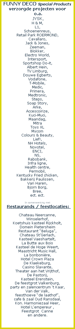Neem contact op per telefoon op 043-3440661 of per email op info@funnydeco.nl. Samen kunnen we dan doornemen welke wensen wij kunnen vervullen en u een passend voorstel / offerte per email laten toekomen.